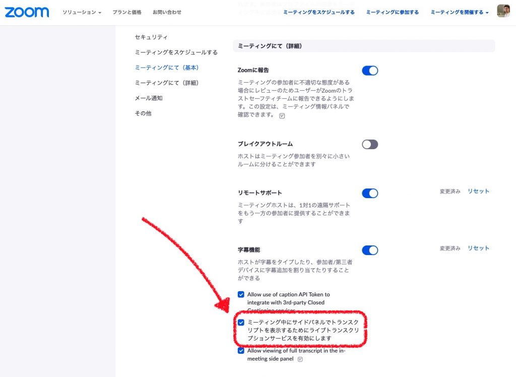 Zoomの公式サイトから管理画面にログインします。**** 1.サイドバー 個人内の設定 をクリック 2.ミーティングにて(詳細)内の字幕機能 を 「ミーティング中にサイドパネルでトランスクリプトを表示するためにライブトランスクリプションサービスを有効にします 」のチェックボックスをオンに**** 3.Zoomミーティング中に、アプリの字幕ボタンから、ライブトランスクリプト(自動トランスクリプションを有効化) をオンに