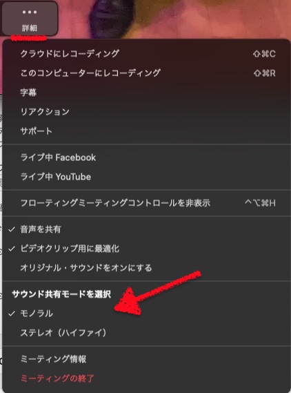 先程のウィンドウ共有で表示されていた”コメントを付ける ”が表示されない方法です。 落書きを防ぎたい場合は、この方法にしましょう。 Zoom ビデオ共有画面 Zoom動画再生時のオプション 再生時に表示されるバーの一番右詳細 ボタンから、ステレオ再生を選ぶことができます。